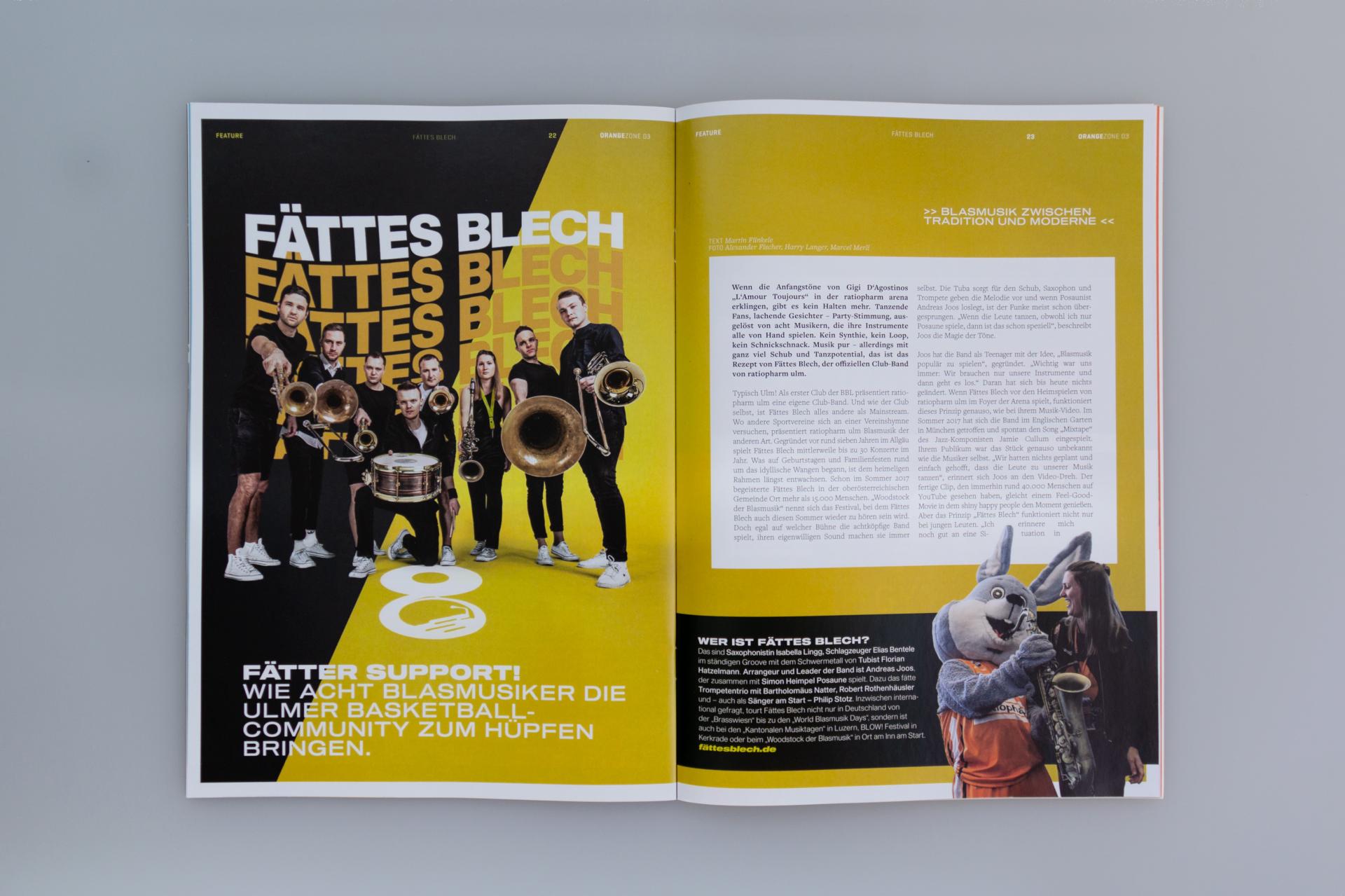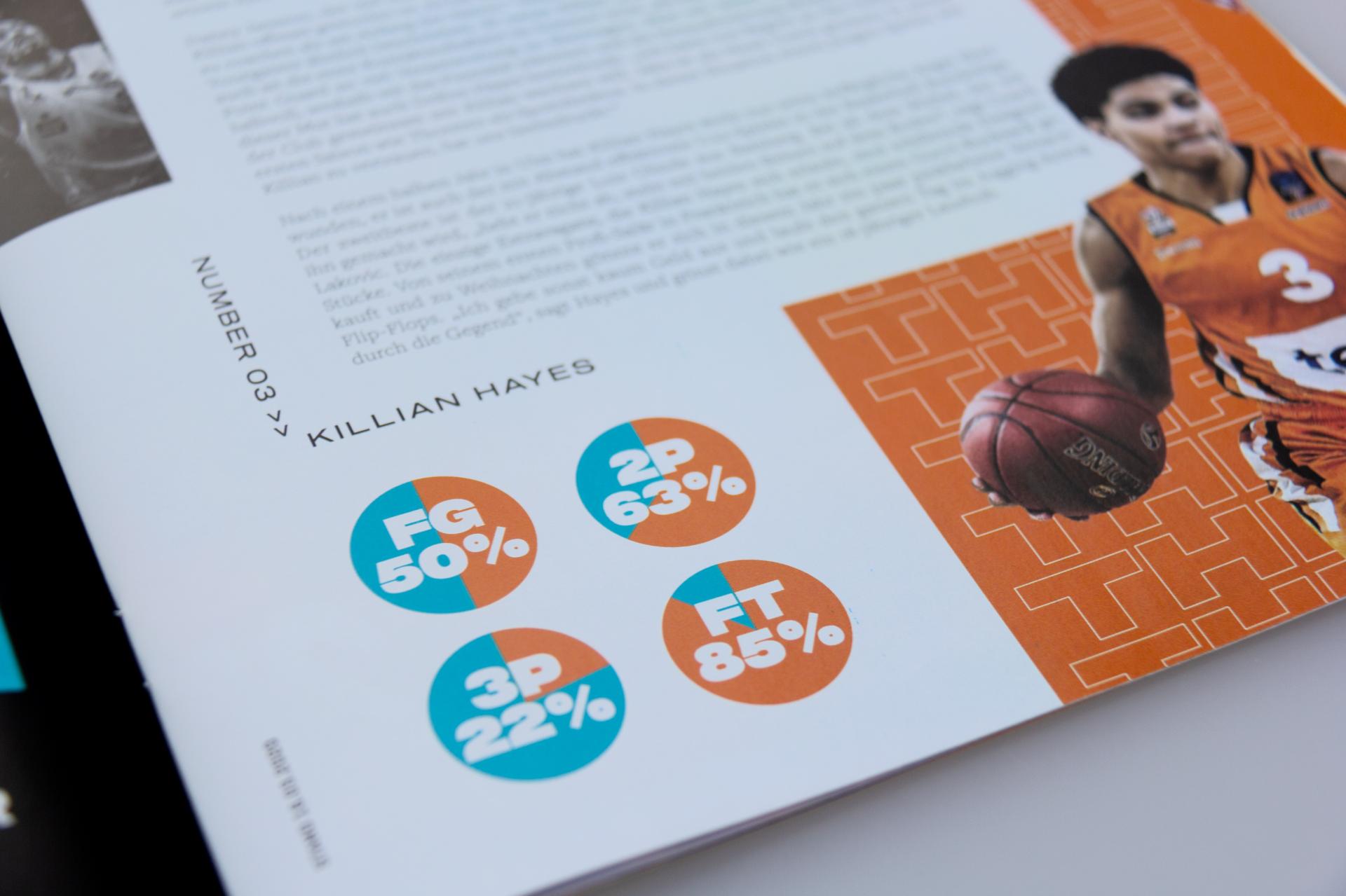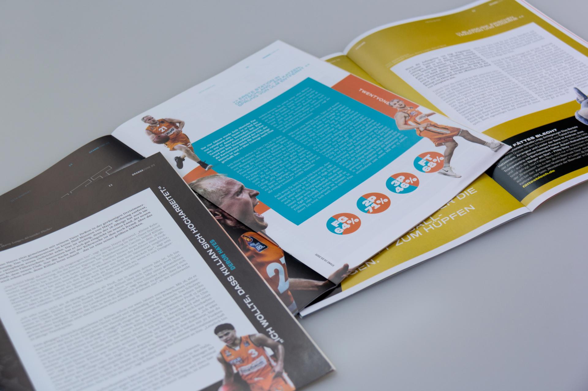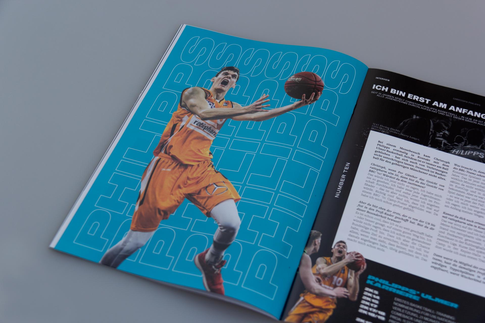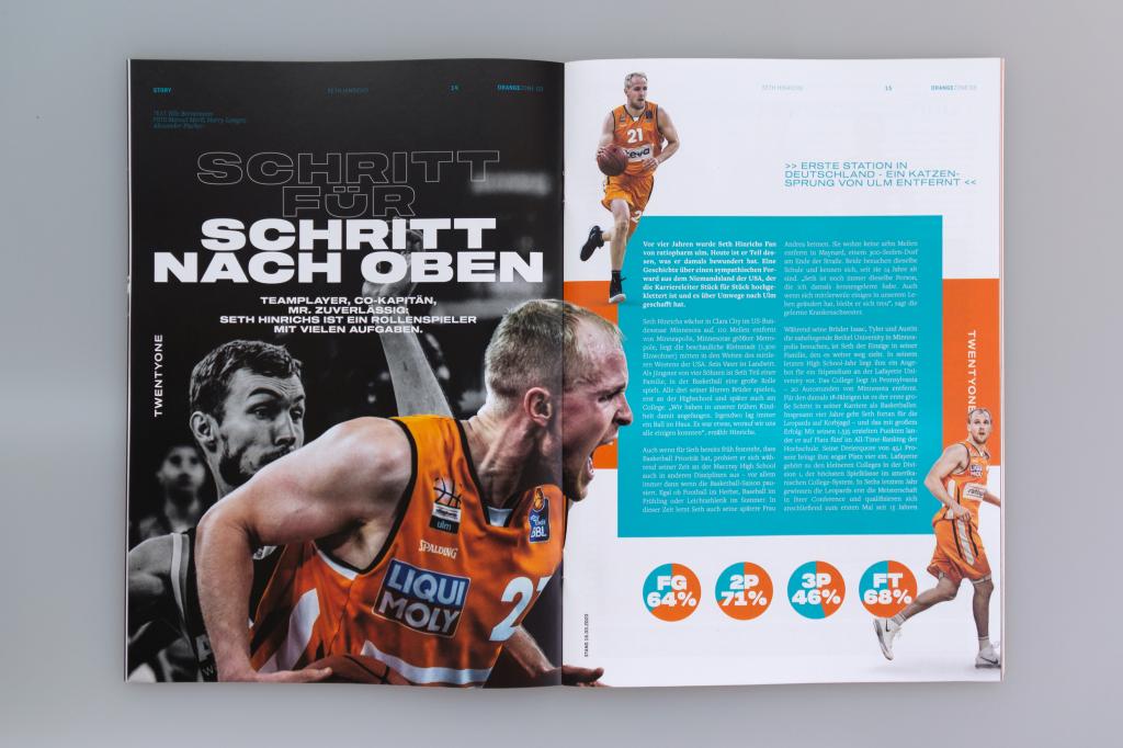 Kontraststarke Farbflächen, actionreiche, durch Freisteller betonte Fotografien und eine aussagekräftige Typografie sind dabei die markantesten Stilmittel des Look & Feel. Und ein weiteres Detail sticht beim Blättern sofort ins Auge: Eine zentrierte Gestaltung mit mittig im Satzspiegel der Seiten platzierten Texten, stark, fokussiert. Schließlich geht es inhaltlich auch um einen kämpferischen Aufruf für den Sport und zum Zusammenhalt gegen das Virus. Für Aufmerksamkeit sorgen auch die neuen Farben, welche das gewohnte Farbspektrum aus Orange, Weiß und Schwarz von ratiopharm ulm erweitern. Alle Artikel mit direktem Bezug zu ratiopharm ulm glänzen in einem satten Türkis. Andere Artikel der Ausgabe erhielten dagegen einen gelben oder grünen Anstrich. Denn wenns um kämpferische Aussagen geht, dann darfs auch bei der Gestaltunges gerne mal knallen!