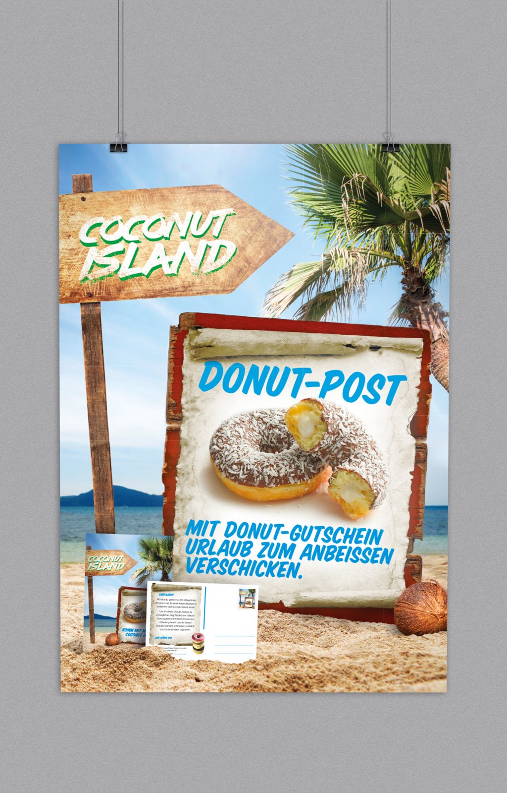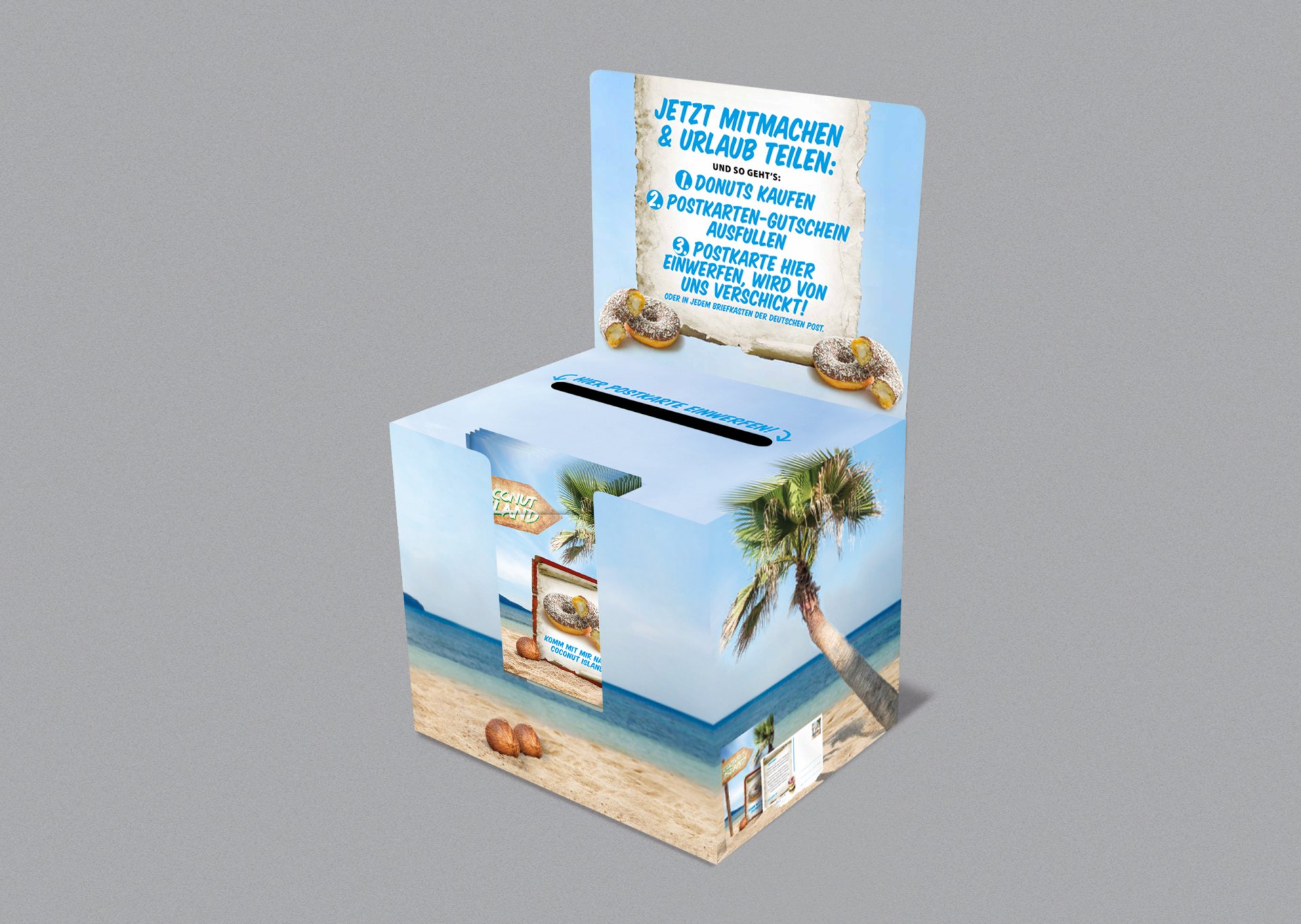 Konzept und Storytelling der Kampagne drehen sich rund um Coconut Island. Ein traumhafter Ort mit schönen Stränden und Palmen, welchem man mit jedem Bissen in den leckeren Coconut Donut näher kommt. Urlaub für den Gaumen sozusagen – zum Anbeissen und Teilen! Denn hinter der Donut-Post-Aktion verbirgt sich eine clevere Mechanik: Bäckereikunden können nicht nur sich selbst, sondern auch Freunden, Kollegen oder der Familie die Donuts und ein bisschen Karibikflair gönnen. Als Gutschein mittels Postkarte – für den „Kurzurlaub“ vom Alltag. Über einen Werbemittler bekommen die Beschenkten die Postkarte nun direkt aus Coconut Island zugesandt, lösen diese gegen ihren Donut beim Bäcker ein und kaufen idealerweise weitere Gebäcke. Dies beschert der Filiale zusätzlichen Umsatz – eine Win-Win-Situation für die beteiligten Partner (neue Produkte und Kunden) und DAWN (Mehrabsatz).