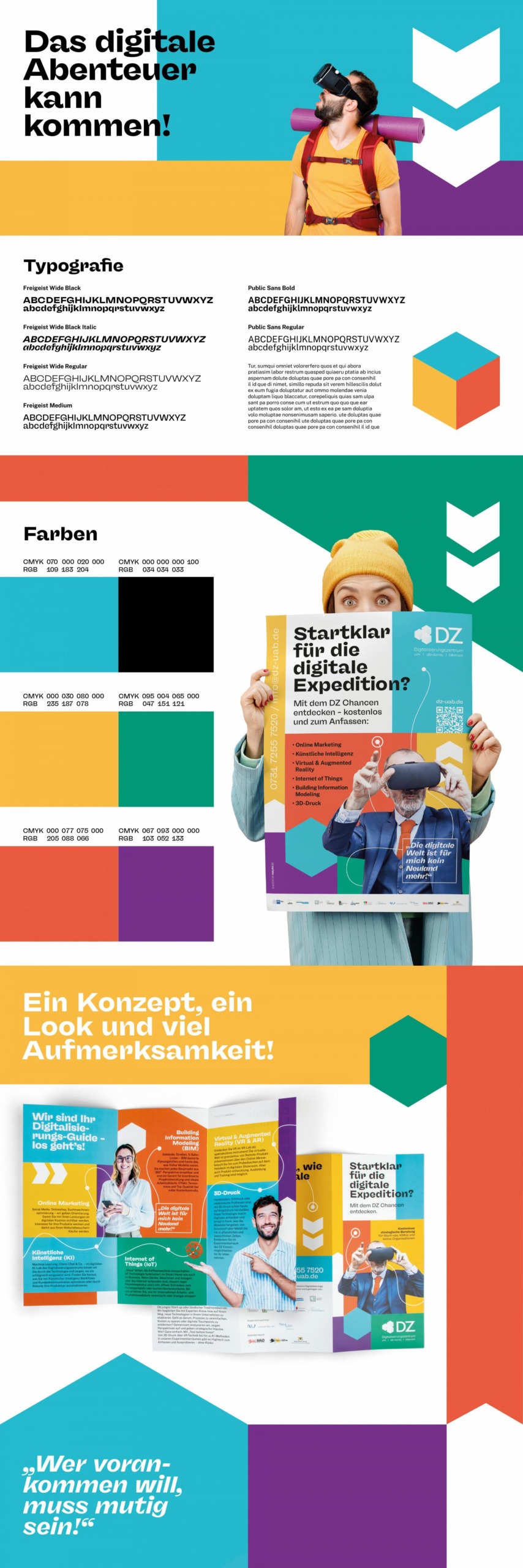 „Startklar für die digitale Expedition?“ Die entwickelte Kampagne schärft die Positionierung des DZ als Digitalisierungs-Guide, mit dessen Hilfe ein müheloser Eintritt in die digitale Welt gelingt. Ein großes und buntes Farbspektrum visualisiert das digitale Abenteuer, Pfeil- und Pfadelemente sowie plakative Typografie bieten Orientierung. Sichtbar wird das durchgängige Konzept auf Plakaten, Flyern, Roll-ups und Social Media. Damit ist eine Kampagne gelungen, die Neugierde auf das Thema Digitalisierung weckt und inhaltlich wie visuell auf eine neue und eigenständige Ebene transportiert.