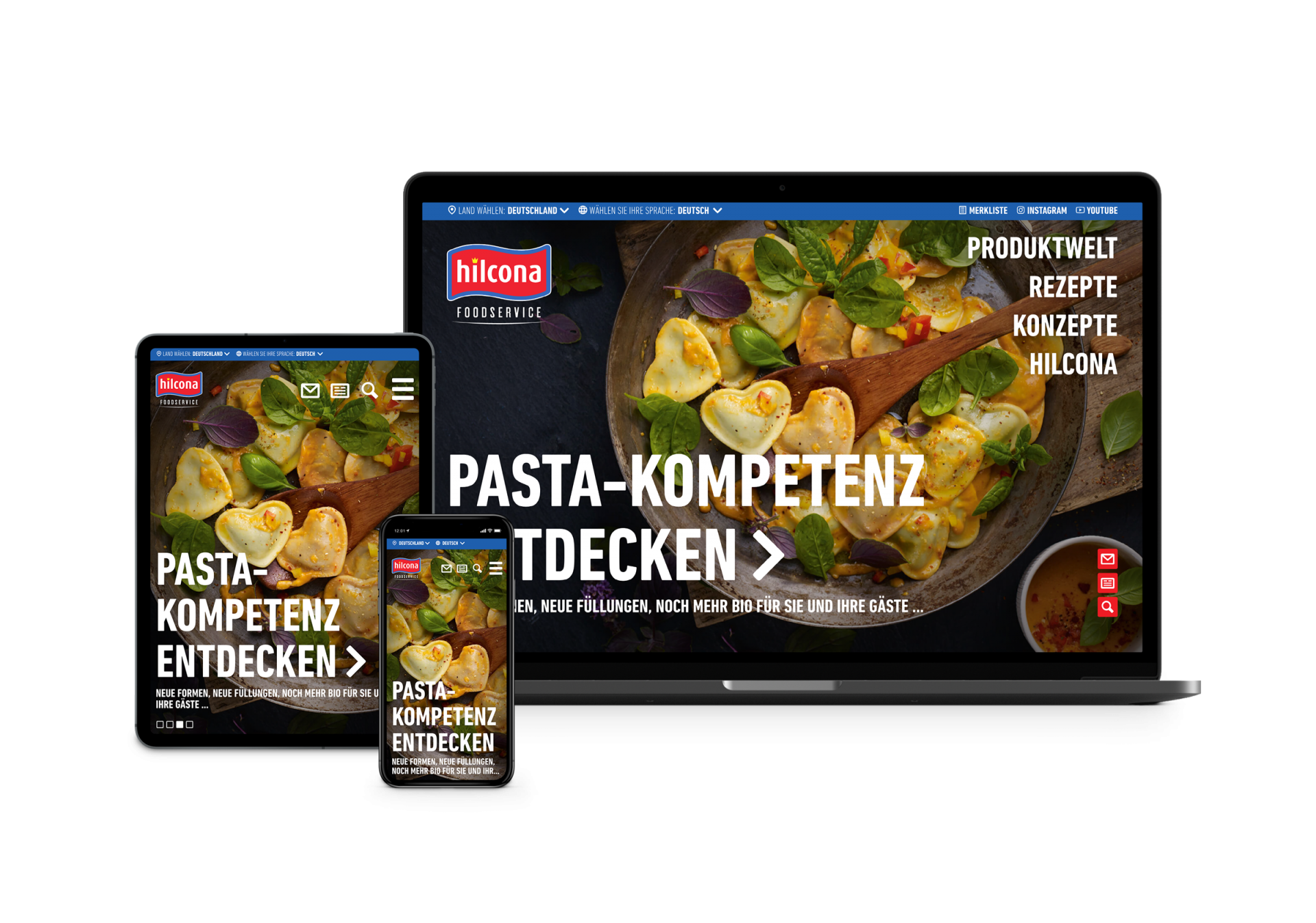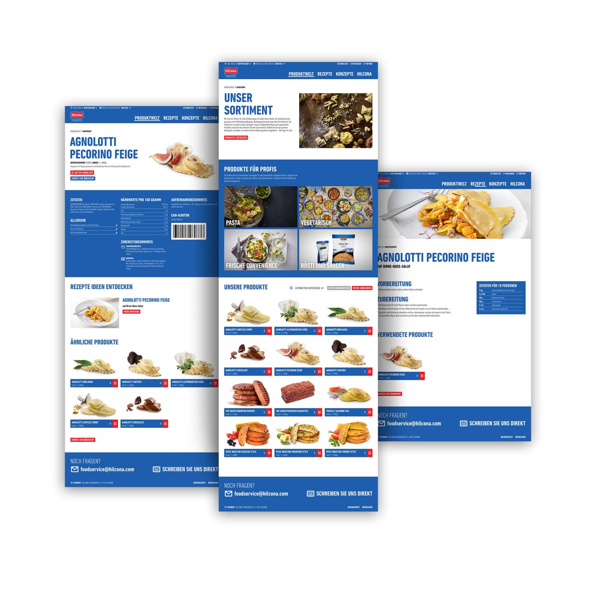Mit neuer Struktur und umfangreichem Funktionskonzept wurden die Inhalte der vorherigen Website komplett überarbeitet und optimiert. Alle bisherigen Produkte sind durch eine Anbindung an die bestehende Datenbank erfolgreich synchronisiert. Auch visuell zeigt sich foodservice.hilcona.com in neuem Gewand: durch klare Strukturen, vollflächige Bilder und plakative Typografie. So bietet die neue Website schnelle Orientierung im gesamten Sortiment. Mehr Service gibts’s durch hilfreiche Funktionen: einen Produktfinder mit zahlreichen Filtern, eine Merkliste sowie eine große Auswahl an passenden Rezepten und Konzepten. Für Messen können eigene Download-Bereiche eingerichtet werden, um für Besucher die passenden digitalen Materialien parat zu haben. Die Website wurde selbstverständlich responsive gestaltet und umgesetzt und für diverse Länder in verschiedene Sprachen adaptiert.