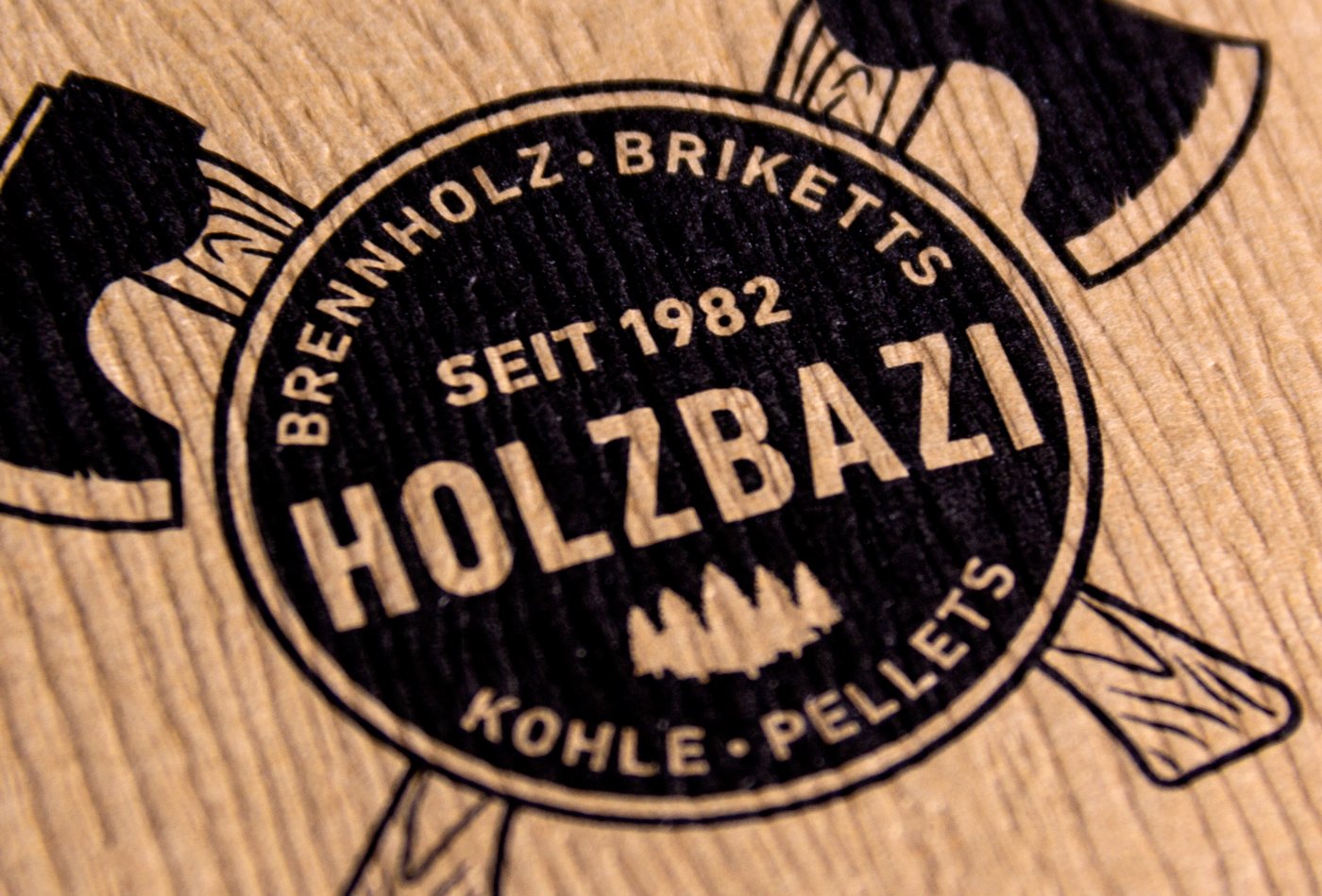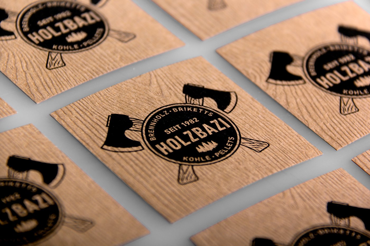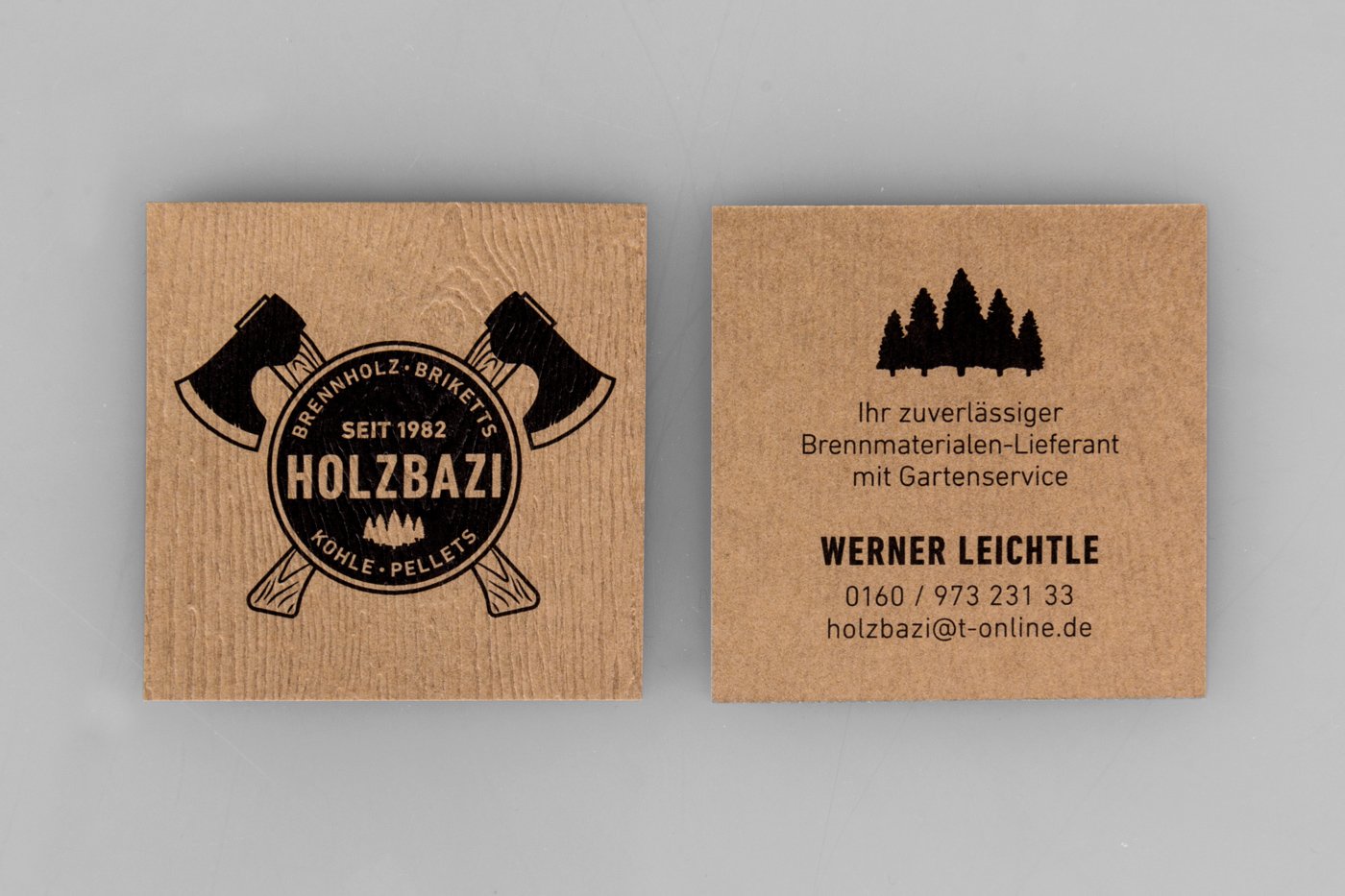 Wie der Name es schon verrät, dreht sich beim Holzbazi alles ums Holz. Bereits seit 1982 versorgt er seine Kunden zuverlässig mit Brennholz, Briketts, Kohle sowie Pellets und bringt auch Gärten wieder in Schwung. Reichlich Infos, welche wir bei der Gestaltung von Logo und Visitenkarte sinnvoll eingestapelt haben. Ein besonderer Hingucker ist auch das Papier der quadratischen Visitenkarte: Optik und Struktur zeigen gleich, dass Holz hier im Mittelpunkt steht.