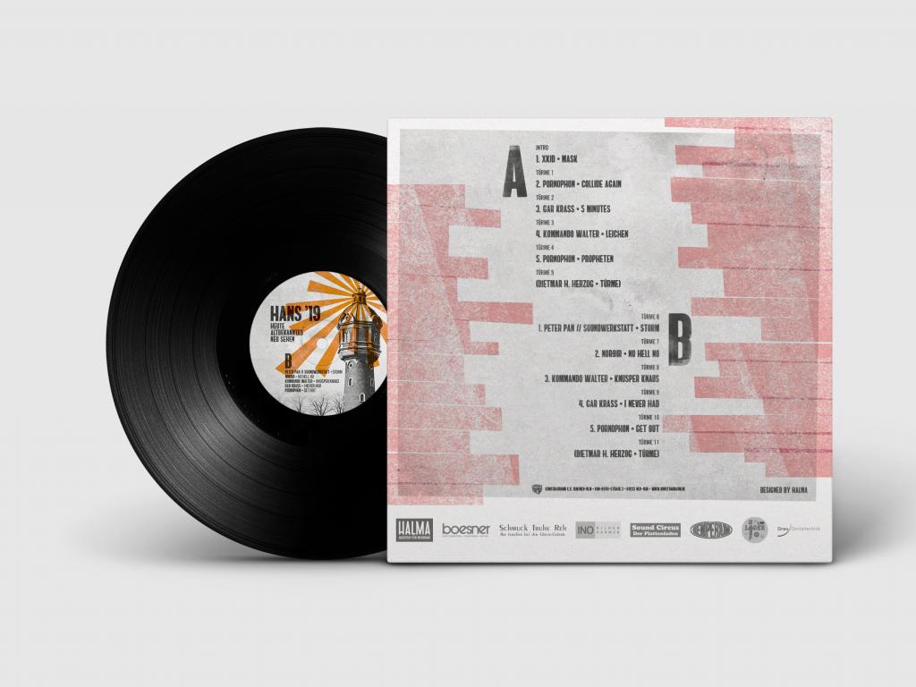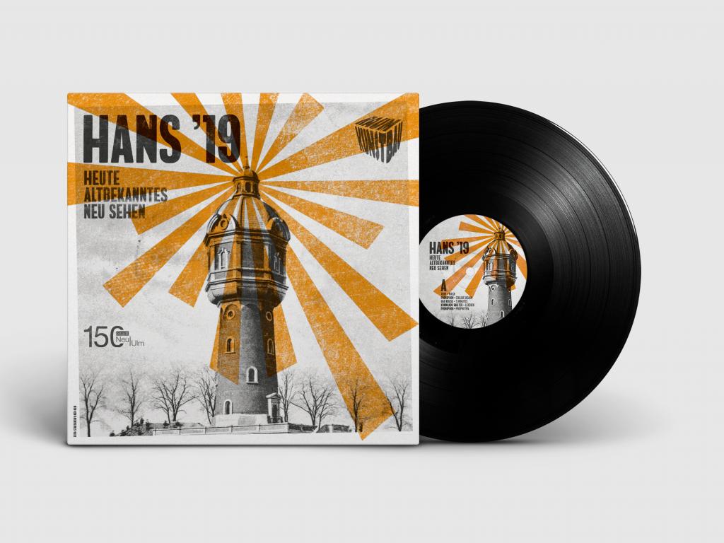Eine historische Aufnahme des Wasserturms, der Location von Hans ’19, haben wir in Letterpress-Optik mit farbigen Grafiken der Künstler des Kunstbauraums und einer markanten Typografie überdruckt. Mit den daraus entstandenen drei Motiven gestalteten wir eine Plakatreihe, ein Schallplattenetikett mit Albumcover und Einleger sowie einen Flyer/Postkarte.