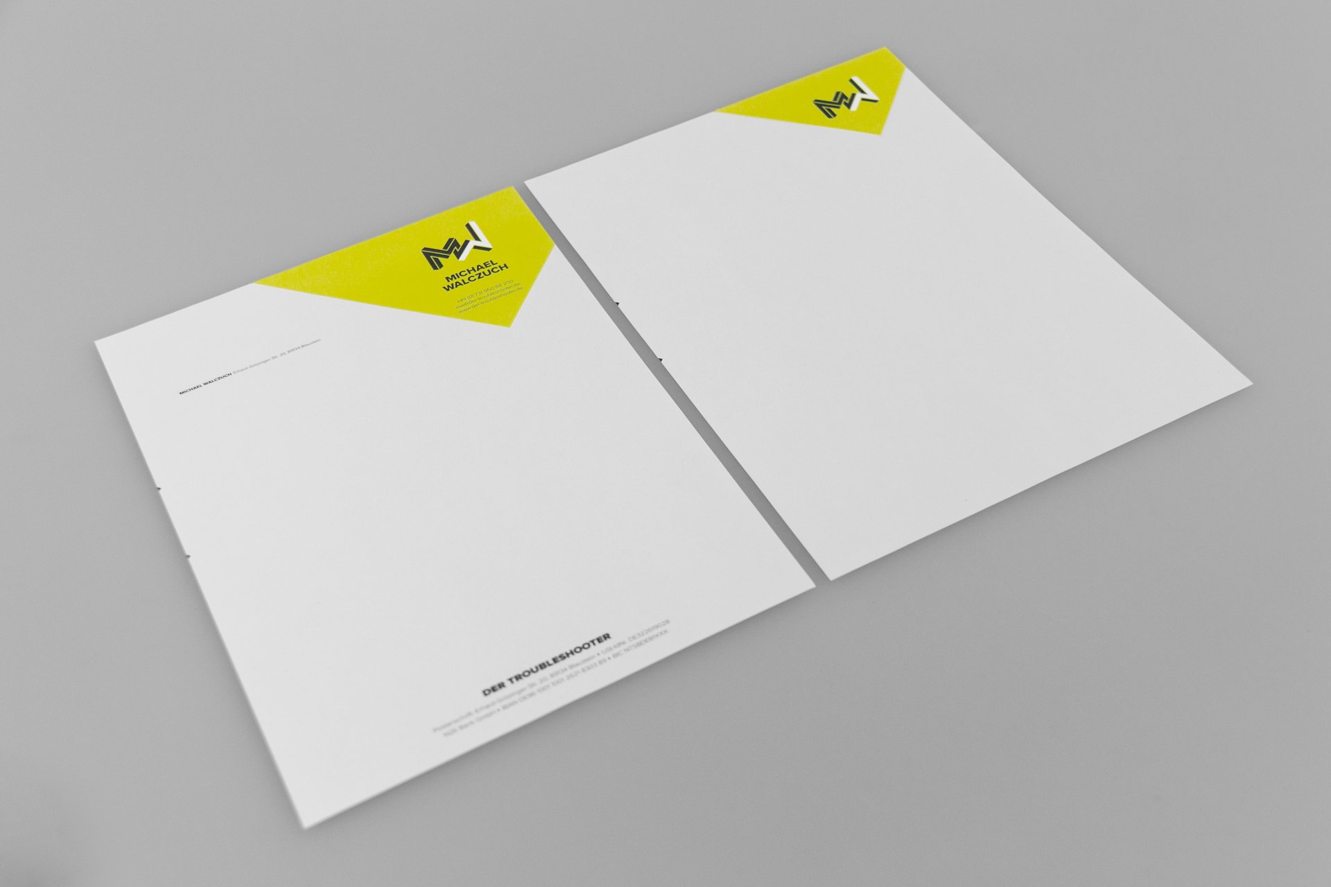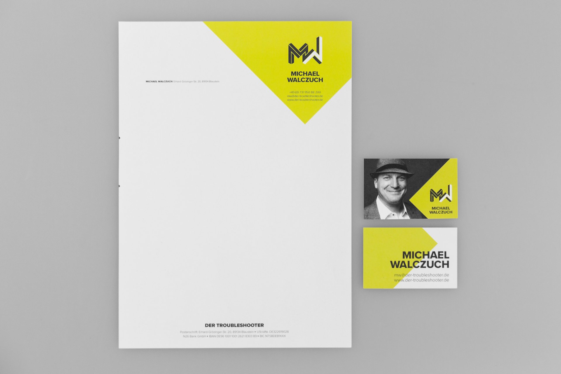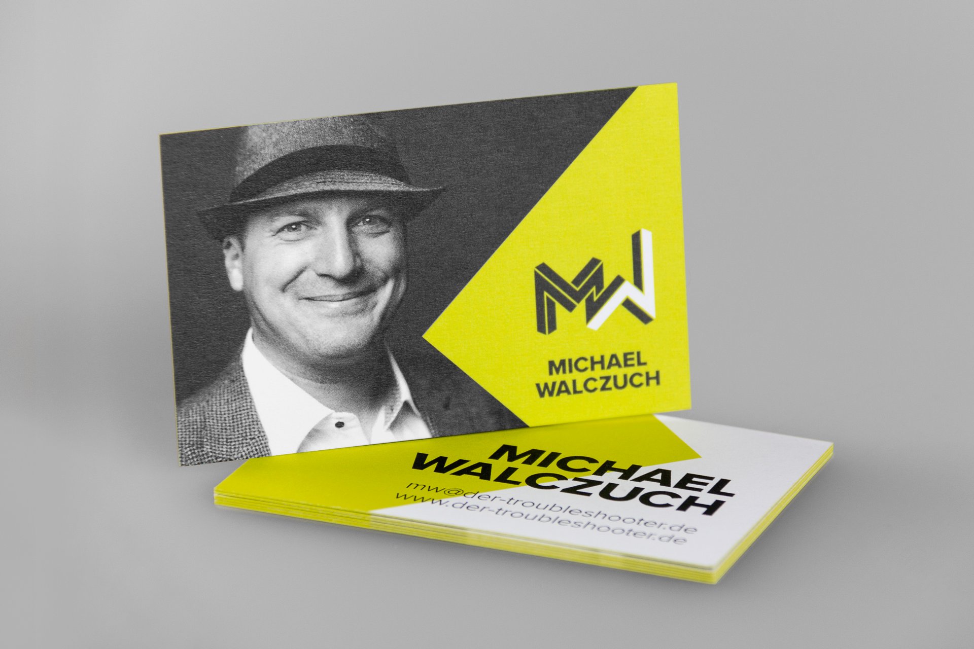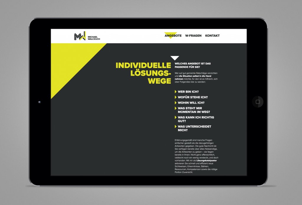 Dieser Ansatz spiegelt sich auch in dem von uns gestalteten Logo wieder. In Anlehnung an das berühmte Penrose-Dreieck sorgen die „verschachtelten“ Initialien von Michael Walczuch für neue Blickwinkel. Eine überraschend ungewöhnliche Darstellung. Dazu kommt ein Farb- und Bildkonzept mit starken Kontrasten, sowie eine ebenfalls kontrastreiche Typografie aus plakativen und leichten Schriftschnitten. Zur zentralen Form wird das aus dem Logo abgeleitete Dreieck. Das „richtungsweisende“ Element ist variabel einsetzbar, von großen Farbflächen bis hin zu kleinen Bulletpoints. Auf Basis des erarbeiteten Corporate Design realisierten wir neben der Geschäftsausstattung auch gleich die passende Website, umgesetzt mit dem von uns mit-entwickelten Content-Management-System „content-o-mat“.