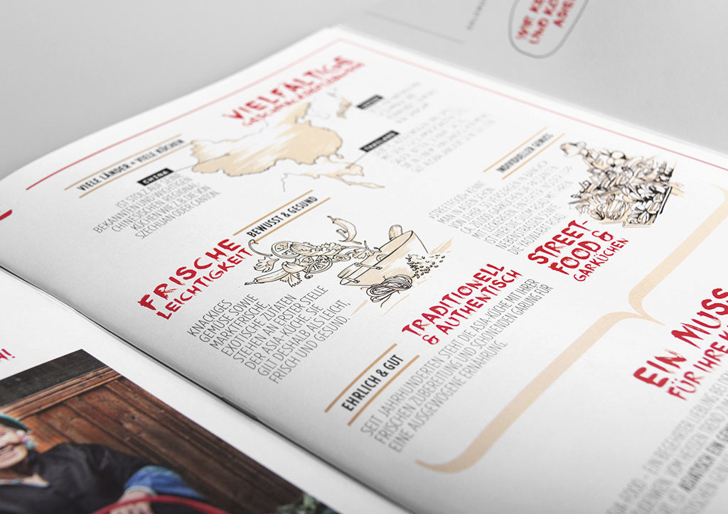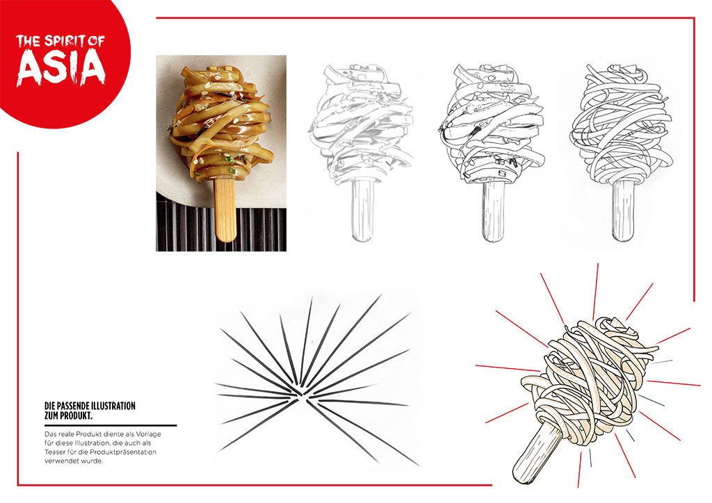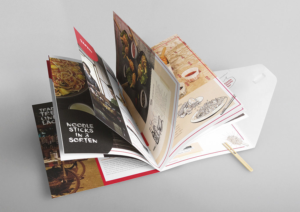 Das für den Produktlaunch entwickelte Konzept „The Spirit of Asia“ wurde als Launch-Kampagne crossmedial gespielt. Authentisch und inspirierend, wie die Produkte selbst. Und auch das 20-seitige Magazin „The Spirit of Asia – Fernweh für den Gaumen“ ist nicht nur durch seinen ungewöhnlichen Verschluss – einen original Noodle Stick – ein optischer Eyecatcher. Eine genussvolle Mischung aus anregender Produktfotografie, grafisch und illustrativ abgebildeten Produktinformationen, sowie Tipps und Tricks für Profi-Köche im Bereich der Zubereitung und Präsentation, laden zum Verweilen und Ausprobieren ein!