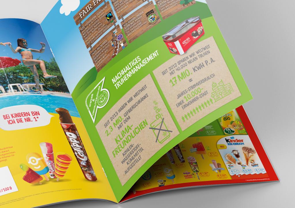 Entstanden ist ein Folder so bunt wie das breite Produktportfolio von Langnese, gleichzeitig klar strukturiert und plakativ gestaltet. Das perfekte Tool für die Kundenakquise – so ist das Eis im Erstgespräch garantiert schnell gebrochen …